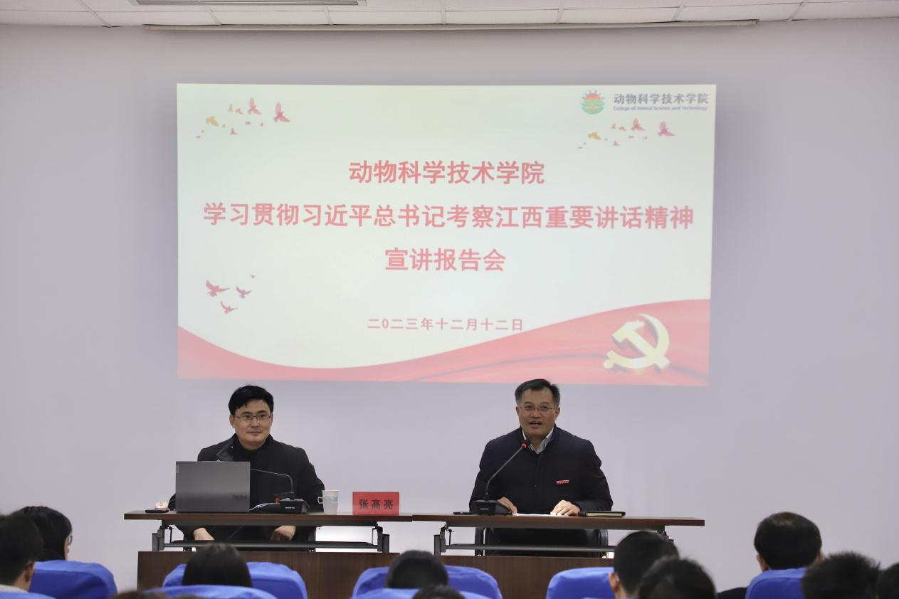 在全校上下要學習貫徹習近平總書記考察江西重要講話精神之際,1212午,副校長、黨委委員張高亮赴動科院作宣講報告,學院師生黨員、團員青年等100人聆聽報告。