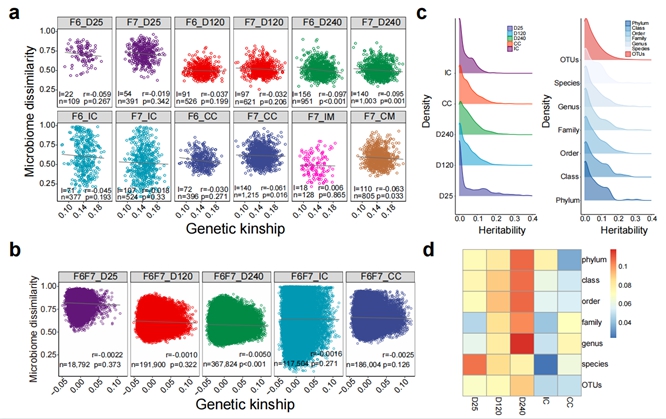 二、發現腸道菌群組成及豐度的可遺傳性:通過對實驗豬只的飼料、飼養、健康及環境條件的統一標準管理,在F6和F7兩個世代中分別鑒別到1050和955個細菌分類(OTU和taxa)可遺傳,最高遺傳力可達0.598 (YRC22屬),450個可遺傳的細菌分類在F6和F7兩個世代中被重復驗證,并且部分可遺傳的細菌分類與人類腸道中的研究結果相一致,如Christensenellaece在人和豬中都具有高的遺傳力,由此證明腸道菌群的組成是可以遺傳的;