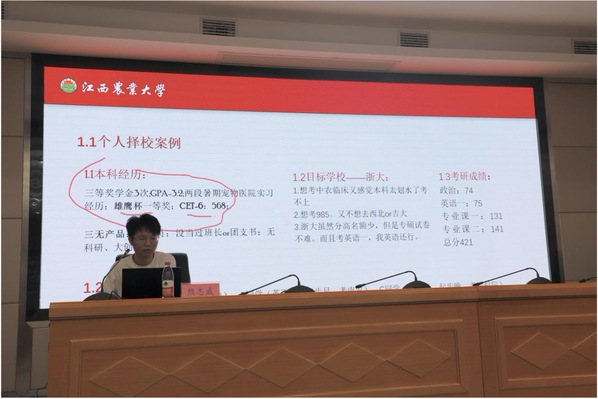 吳小波就“為什么要讀研究生”“研究生考什么”“怎么考研究生”三個方面,結合深厚的專業背景和豐富的考研指導經驗,深入淺出的進行考研全過程輔導,積極引導學生樹立合理的考研目標、鼓勵學生認真備考。隨后,動物醫學1802班熊志威以“浙江大學,我來了”為題,分享考研經驗,“干貨”滿滿。