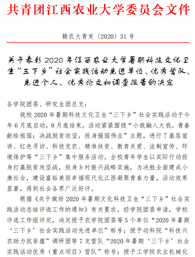 近日,校團(tuán)委下發(fā)關(guān)于表彰2020年江西農(nóng)業(yè)大學(xué)暑期科技文化衛(wèi)生“三下鄉(xiāng)”社會(huì)實(shí)踐活動(dòng)先進(jìn)單位、優(yōu)秀營隊(duì)、先進(jìn)個(gè)人、優(yōu)秀論文和調(diào)查報(bào)告的決定,我院團(tuán)委榮獲2020年暑期“三下鄉(xiāng)”社會(huì)實(shí)踐活動(dòng)先進(jìn)單位,“科技興農(nóng)助力抗非瘟”調(diào)研團(tuán)榮獲2020年暑期“三下鄉(xiāng)”社會(huì)實(shí)踐活動(dòng)優(yōu)秀(重點(diǎn)項(xiàng)目)營隊(duì),據(jù)悉,該調(diào)研團(tuán)榮獲2020年全國大中專學(xué)生志愿者暑期“三下鄉(xiāng)”社會(huì)實(shí)踐活動(dòng)優(yōu)秀團(tuán)隊(duì)。“掌上明豬?地方豬守護(hù)”調(diào)研團(tuán)榮獲2020年暑期“三下鄉(xiāng)”社會(huì)實(shí)踐活動(dòng)優(yōu)秀(一般項(xiàng)目)營隊(duì),動(dòng)醫(yī)1802班陳鳳和程婷、動(dòng)科1801班賀紫瓊、動(dòng)科1803班楊晨榮獲2020年暑期“三下鄉(xiāng)”社會(huì)實(shí)踐活動(dòng)先進(jìn)個(gè)人,《江西省地方豬遺傳資源保護(hù)利用現(xiàn)狀與對(duì)策》以及《深入調(diào)研在非洲豬瘟影響下的養(yǎng)豬行情》榮獲2020年暑期“三下鄉(xiāng)”社會(huì)實(shí)踐活動(dòng)優(yōu)秀論文和調(diào)研報(bào)告。