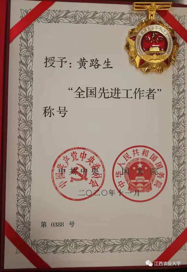 11月24日,2020年全國勞動模范和先進工作者表彰大會在北京人民大會堂召開。全國勞動模范和先進工作者代表依次登上主席臺,習近平等為他們頒發榮譽證書。江西農業大學黨委書記黃路生院士榮獲“全國先進工作者”稱號。