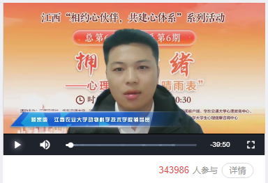 學(xué)院實施“本科生導(dǎo)師制”,為每一位本科生配備導(dǎo)師,做好思想引領(lǐng)、學(xué)業(yè)指導(dǎo)、學(xué)術(shù)科研的同時加強(qiáng)對學(xué)生人文關(guān)懷和心理疏導(dǎo)。專業(yè)教師充分發(fā)揮學(xué)科優(yōu)勢,積極參與心理健康教育研究與實踐指導(dǎo),將科研成果轉(zhuǎn)化為教學(xué)資源,將科學(xué)研究中遇到困難到堅定方向的心路歷程等巧妙融入專業(yè)課程教學(xué)之中,助力學(xué)生構(gòu)建系統(tǒng)全面的知識體系與科學(xué)思維方式,從專業(yè)學(xué)習(xí)角度引導(dǎo)學(xué)生樹立正確的心理健康觀念。輔導(dǎo)員作為學(xué)生成長道路上的引路人,通過日常談心談話、定期心理健康篩查等方式,密切關(guān)注學(xué)生心理變化,及時察覺并妥善處理心理問題。其中,輔導(dǎo)站一名輔導(dǎo)員參加了由江西日報社、華東交通大學(xué)、江西省學(xué)校心理健康教育中心聯(lián)合主辦的“相約心伙伴,共建心體系”全省直播訪談活動,吸引了三十余萬人次觀看,進(jìn)一步提升了學(xué)院心理健康教育的知名度和影響力。