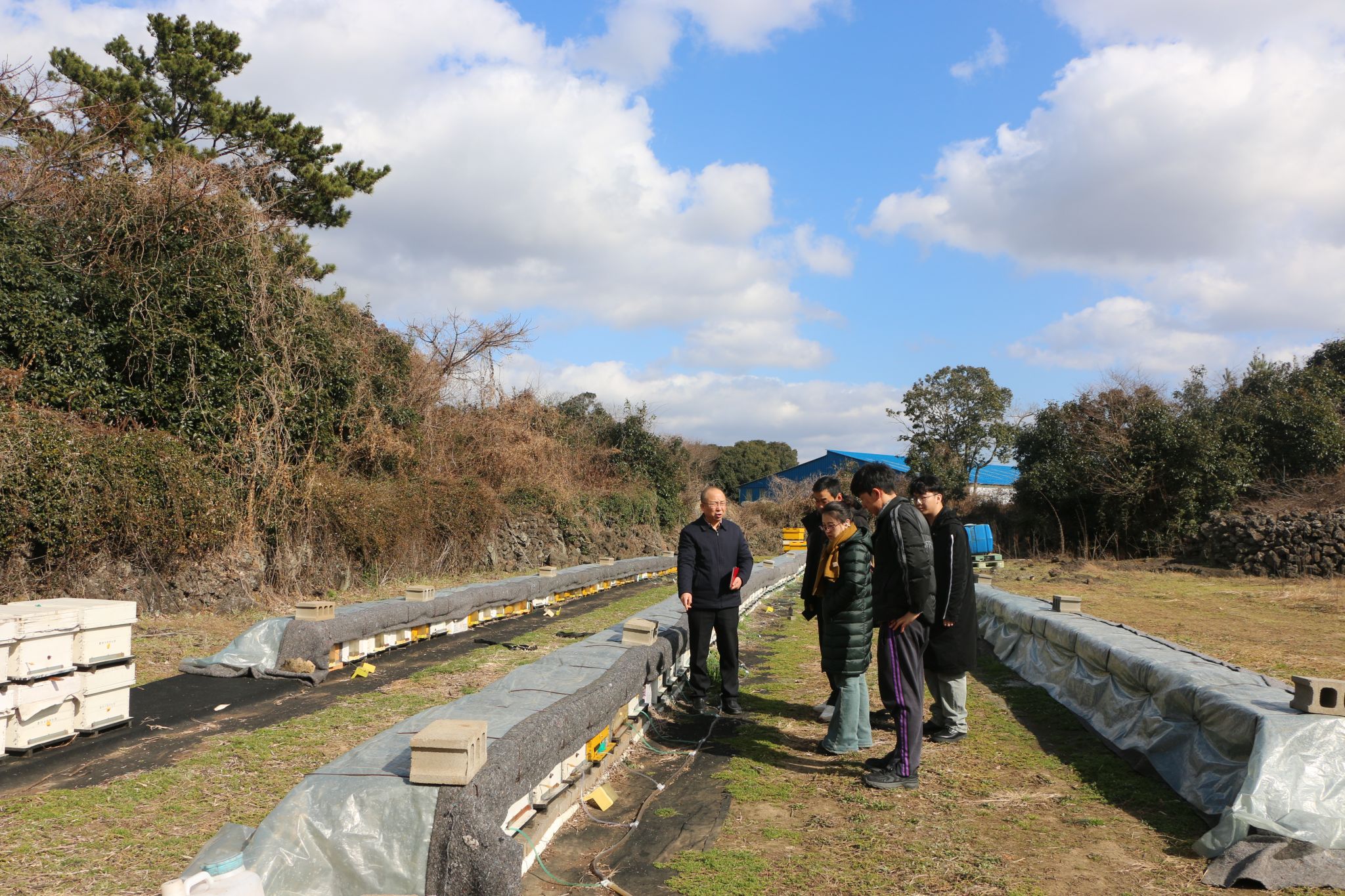 會前,曾志將教授一行還參觀了楊宇錫(???)先生位于濟州島的蜂場,楊宇錫先生擁有27年豐富養蜂經驗,其蜂場規模200-300群,年產蜂蜜現達15-20噸。據悉,濟州島當地主要蜜源植物為柑橘,蜜蜂規模達4萬群,蜂蜜品質優良,深受市場歡迎。楊宇錫先生介紹,其蜂場生產蜂蜜主要通過農協渠道銷售,批發價50元/斤(人民幣),市場零售價可達75元/斤(人民幣)。蜂王漿市場零售價可達2000元/斤(人民幣)。此外蜂場還提供蜜蜂授粉服務,蜜蜂授粉收入可達1000-1500元/群(人民幣)。