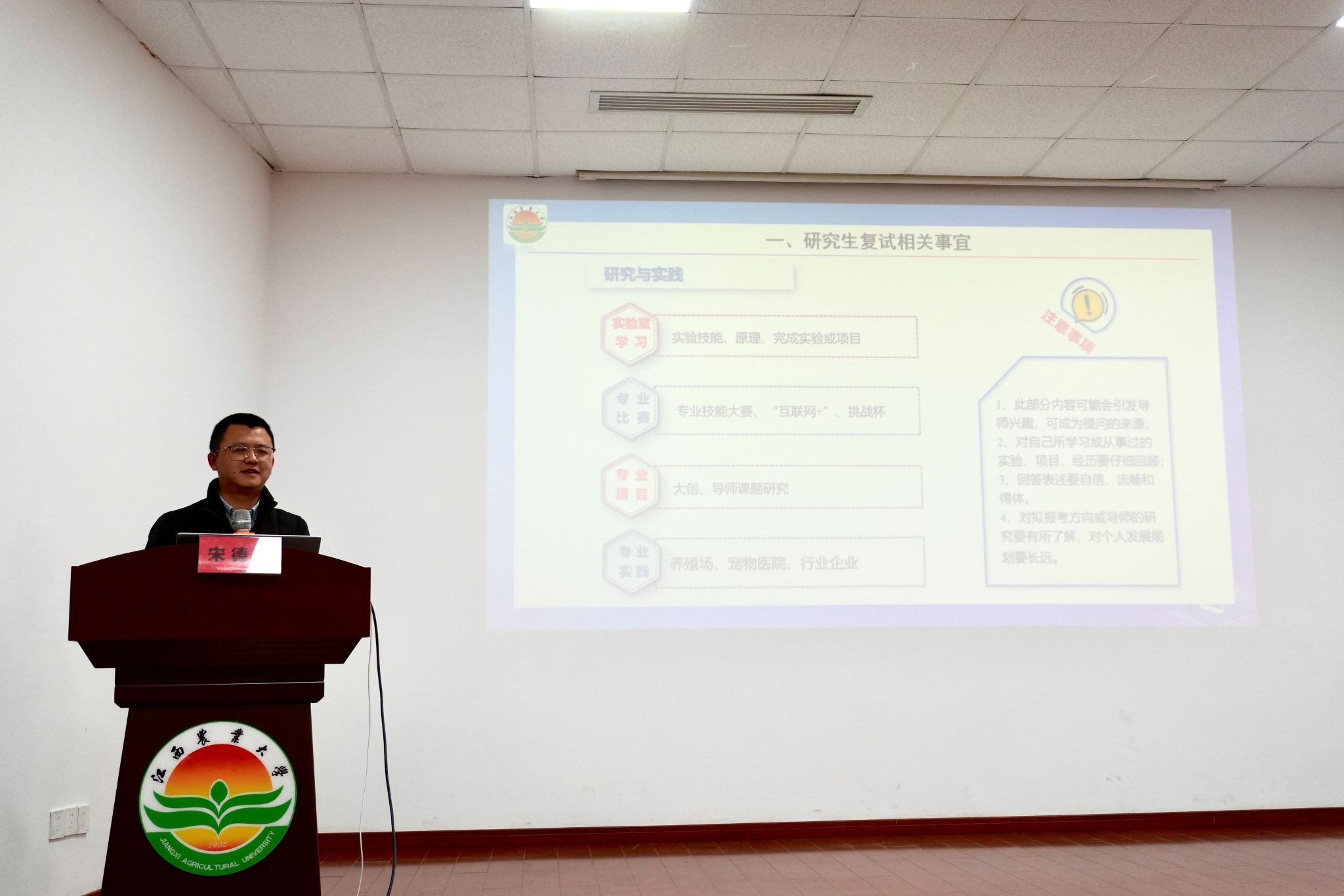會議伊始,動物醫學教工一支部副書記宋德平老師,分別從聯系導師、專業課準備和心態調整等幾個方面進行指導,提醒同學們一是要做好前期準備,熟悉復試流程,準備好相應的證件和資料;二是注意儀容儀表,口齒清晰,塑造良好的第一印象;三是從容應對,保持自信沉穩的心態,展現出自身專業素養和思維能力。