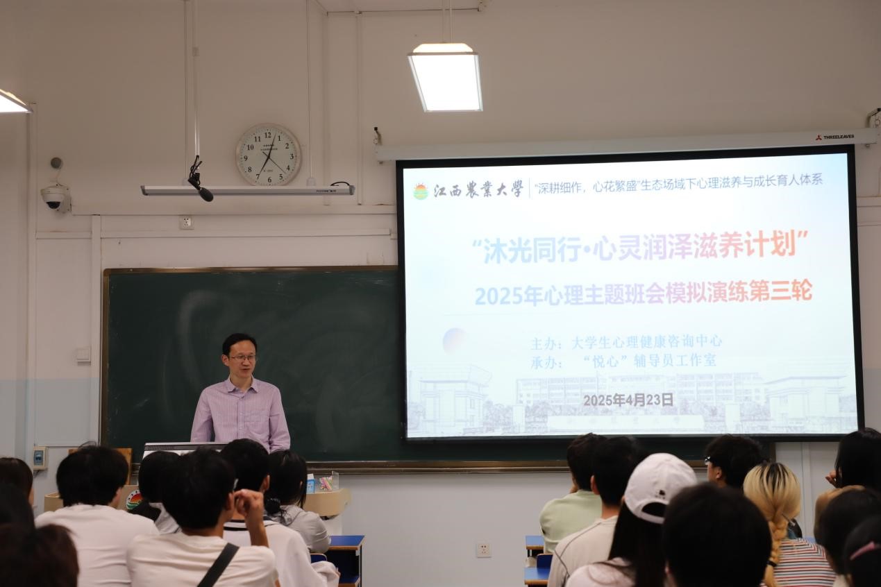 為深入貫徹落實習近平總書記關于加強學生心理健康教育工作的重要指示精神,切實提升心理育人實效,4月23日晚,由校大學生心理健康咨詢中心策劃的“沐光同行·心靈潤澤滋養計劃”精品心理主題班會在我院試行開展。二級心理輔導站副站長吳興老師和輔導員熊毅靜老師到場指導,學院心理朋輩部全體成員及2024級心理委員參與其中,現場氛圍熱烈。