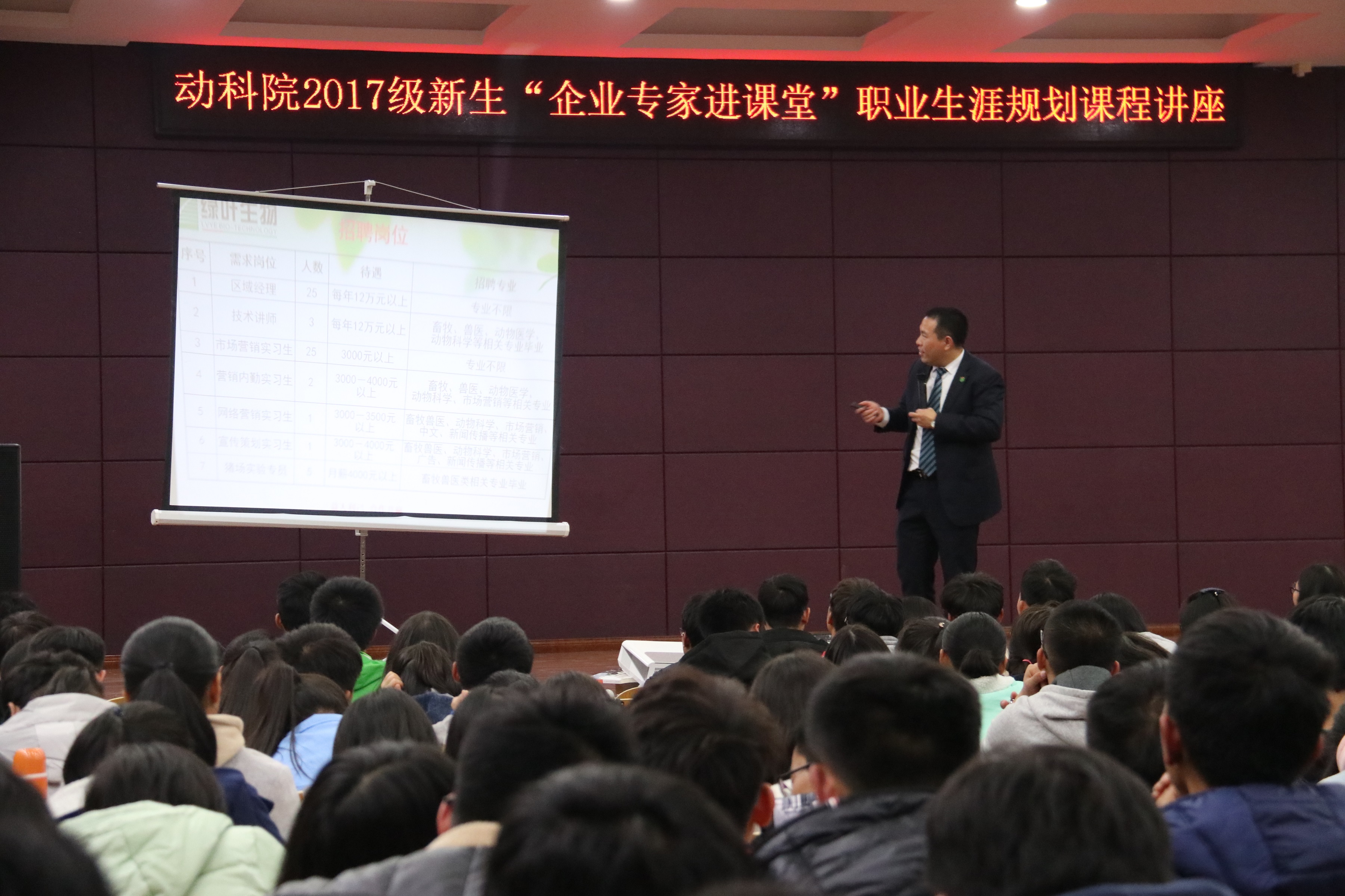 此次講座邀請了湖南長沙綠葉生物科技有限公司人力資源總監童松林。他結合當前畜牧行業現狀、企業人才需求及大學生職業規劃意義等內容為2017級新生講授了一堂題為《如何成為深受養殖行業歡迎的大學生》的課。以人才培養與職業生涯規劃間不可分割的關系為切入點,為2017級新生講授了人才培養與職業生涯規劃的重要性。同時為新生講述了現代畜牧養殖業的發展現狀,以食品質量安全、生態規模養殖為例講述了企業需求人才的標準,希望動科院2017級學生做好職業規劃,學好專業知識,提升專業技能,才能在未來的職場制勝,才有能力為現代畜牧業做出貢獻。