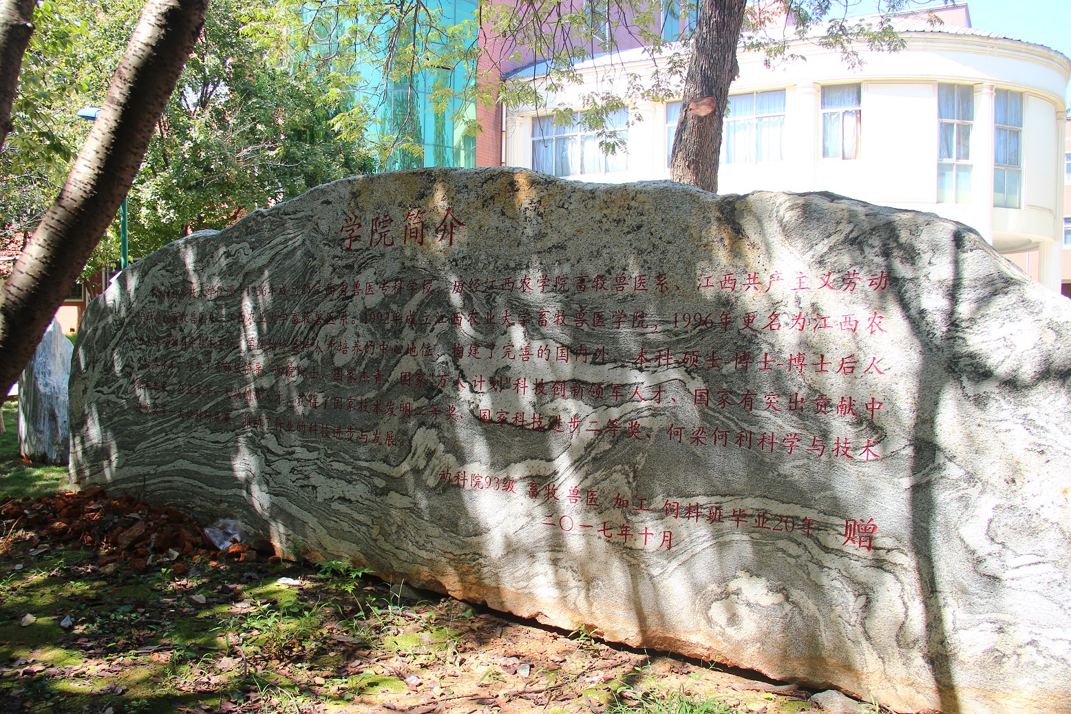 今年9月,我院93級畜牧、獸醫、食品加工和動物營養與飼料科學四個班級畢業20年為我院捐建石碑。石碑氣勢雄偉、石刻字體豐勁,其上鐫刻“動物科學技術學院”八個大字,端莊而不失大氣,雅致而不失沉穩;石碑兩側“誠信,勤勉”四個字寓意深刻,是我院文化建設的一大景觀,也將是弘揚優良院風、培養動科精神的標志物。