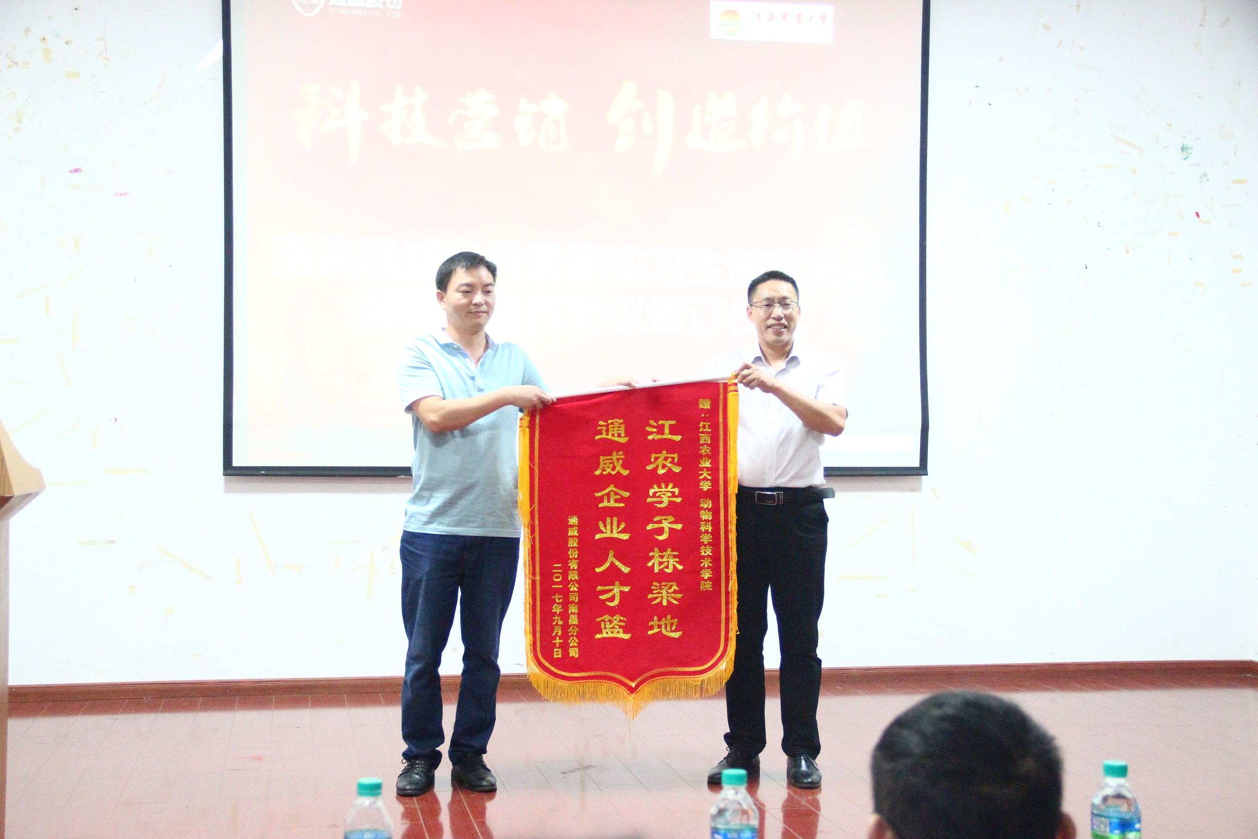 9月24日下午,南昌通威優秀暑期實習生頒獎典禮暨校企合作簽訂儀式于院辦201報告廳順利舉行。我院副院長曹華斌、團委書記管國泉、水產系副主任阮記明、講師彭墨以及通威股份有限公司南昌分公司負責人出席本次會議。