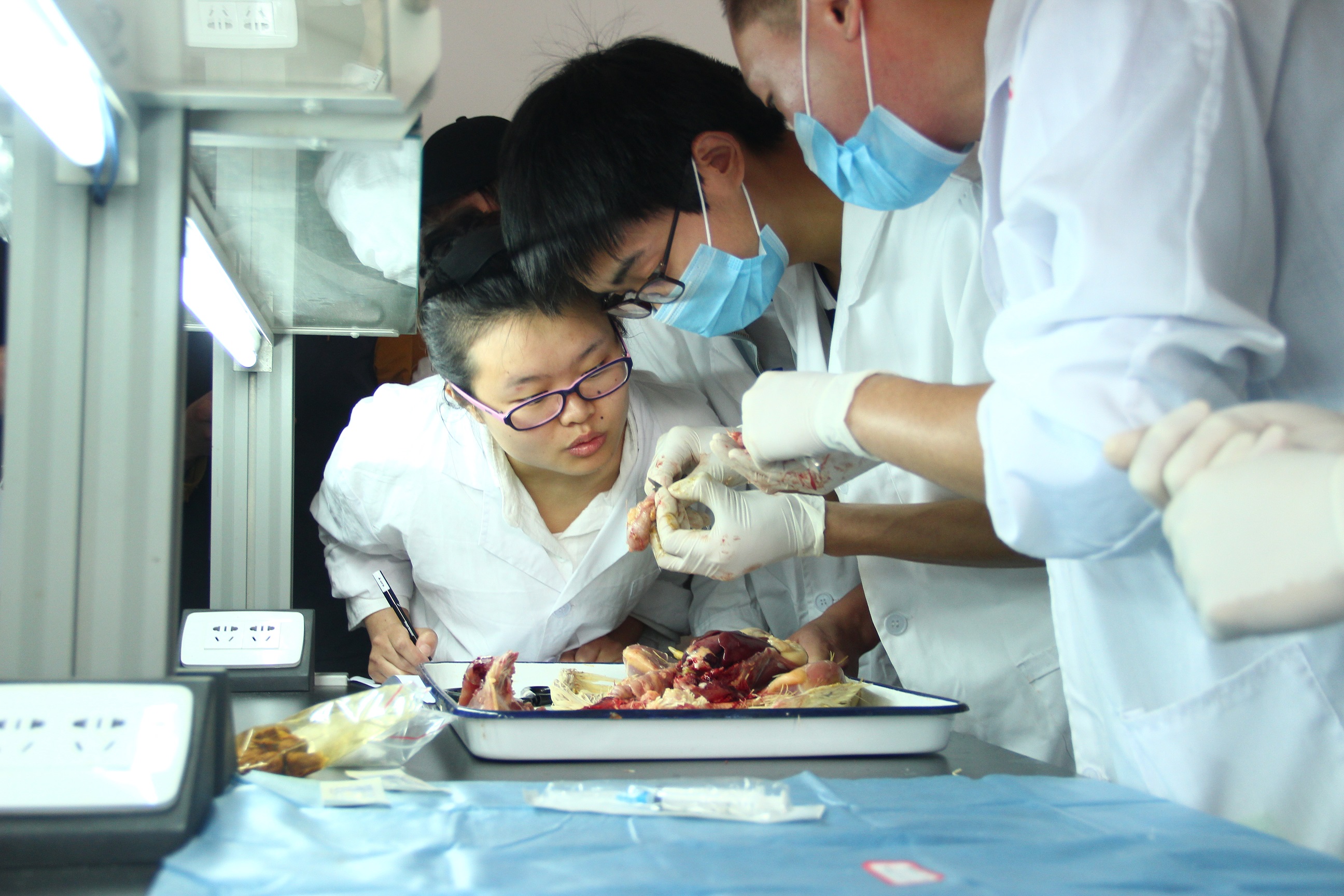 經(jīng)過初賽的理論考核,共25組109名選手進入決賽。根據(jù)年級專業(yè)的不同,選手們被分為專業(yè)一組、專業(yè)二組和非專業(yè)組。此次決賽包括犬的麻醉胃切開、摻假魚粉的鑒定以及家兔的解剖等比賽項目。在比賽過程中,選手們沉著應賽,認真對待每一個步驟,并且充分運用自己的理論知識,嚴格按照標準操作,力求規(guī)范準確。由各專業(yè)老師組成的裁判小組公平公正,根據(jù)參賽選手的操作規(guī)范以及熟練程度進行打分。