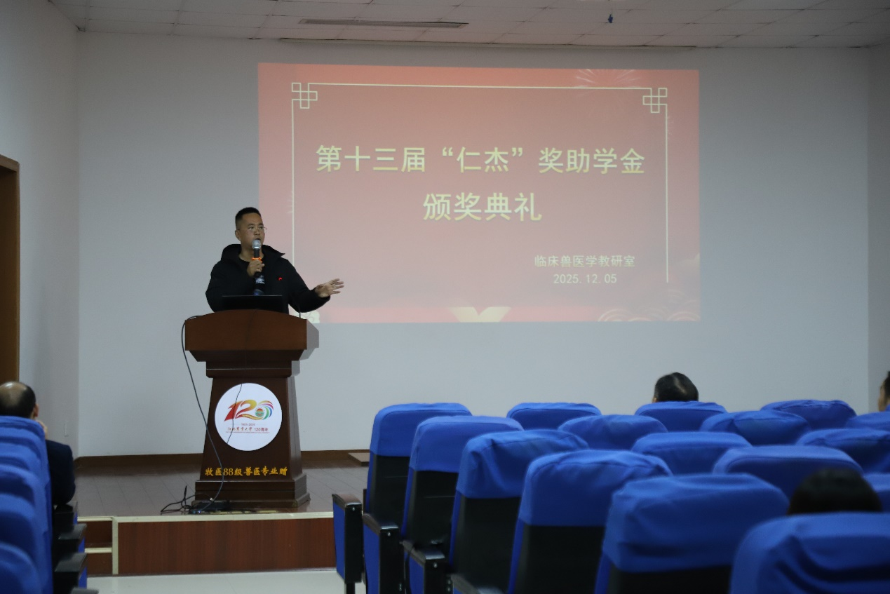近日,江西農(nóng)業(yè)大學(xué)動物科學(xué)技術(shù)學(xué)院第十三屆“仁杰獎助學(xué)金”頒獎典禮在院201會議室舉行。研究生院院長郭小權(quán)教授、動科院副院長吳小波教授、2013屆臨床獸醫(yī)學(xué)杰出校友匡俊先生及臨床獸醫(yī)學(xué)學(xué)科全體師生參加典禮。