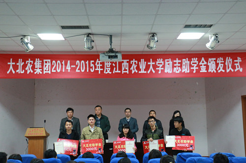 11月9日晚,大北農集團勵志助學金頒獎儀式在院辦201報告廳成功舉行。大北農集團江西事業部預混料公司總經理黃壘榮,江西區人力資源部經理鄧璞江,院長瞿明仁,院黨委書記陸偉,院黨委副書記楊秀江出席了頒獎儀式。