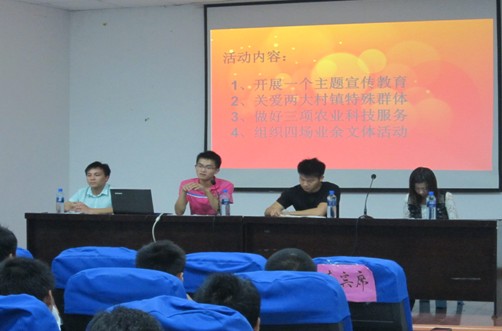 為豐富大學(xué)的業(yè)余生活,培養(yǎng)大學(xué)生理論運用于實踐的能力和創(chuàng)新精神,9月20日晚7點,由動科院團委舉辦的以“科技興農(nóng)求真知,建團九十創(chuàng)輝煌”為主題的暑期“三下鄉(xiāng)”交流會在201報告廳如期舉行,4名我院的“三下鄉(xiāng)”志愿者被邀請向大一、大二學(xué)生講解自己的暑期實習(xí)經(jīng)歷。