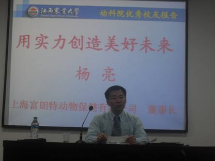 11月10日晚,動(dòng)科院201多功能報(bào)告廳內(nèi)人頭攢動(dòng),熱鬧非凡。我院79級(jí)優(yōu)秀校友、現(xiàn)上海富朗特動(dòng)物保健有限公司董事長(zhǎng)楊亮在此為我院廣大新生舉辦了一場(chǎng)題為“用實(shí)力創(chuàng)造美好未來(lái)”的主題報(bào)告會(huì),教務(wù)處處長(zhǎng)何后軍、院長(zhǎng)瞿明仁、院黨委書(shū)記熊紅華、副院長(zhǎng)胡國(guó)良出席并聽(tīng)取了報(bào)告。