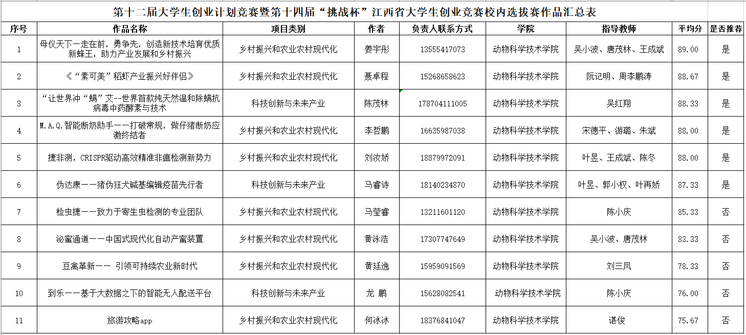 根據《關于舉辦江西農業大學第十二屆大學生創業計劃競賽暨第十四屆“挑戰杯”江西省大學生創業計劃競賽校內選拔賽的通知》要求,經學生自由組隊提交材料、學院組織專家進行網評。按照“好中選優”的推薦原則,學院擬確定6支隊伍參加江西農業大學第十四屆“挑戰杯”江西省大學生創業計劃競賽校賽。