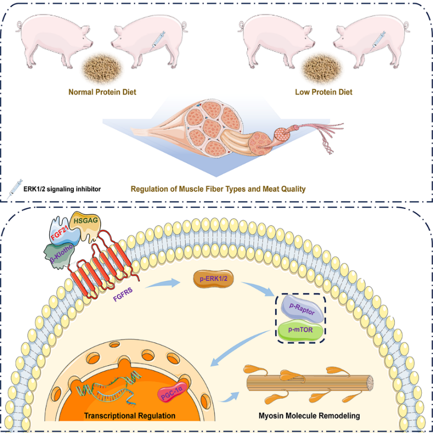 豬肉作為我國主要的肉類消費食品,是人們主要的動物蛋白質來源,但豬肉品質和消費者的預期仍有較大差距。采用低蛋白日糧技術不僅節約蛋白質飼料資源,還是生產優質豬肉產品、實現養豬業高效能的重要途徑。因此,探索低蛋白日糧調節肌肉生物學特性的分子機制,特別是對機體內分泌信號介導的肌纖維發育和肌纖維類型轉化機制研究十分重要,對科學制定低蛋白日糧的營養策略,推動豬肉品質精準調控具有重要的意義。研究團隊采用分子生物學和肌肉代謝組學技術,以日糧蛋白限制的手段誘導仔豬機體FGF21的快速表達和分泌,并通過注射ERK1/2特異性抑制劑,探討了FGF21作為內分泌信號影響豬肉質特性的分子機制。研究發現豬骨骼肌感知FGF21信號,通過激活ERK1/2,誘導mTORC1復合體中Raptor磷酸化,導致mTORC1信號通路活化,從而調控PGC-1α轉錄活性和骨骼肌代謝功能,促進慢速氧化性肌纖維生成。本研究結果明確了FGF21是介導低蛋白日糧促進豬氧化型肌纖維生成的關鍵內分泌信號之一,為動物生產上科學研發豬肉品質調控技術提供了理論支撐。