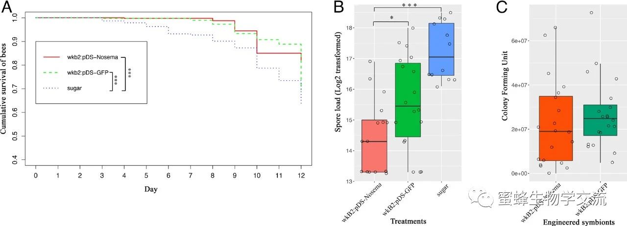 微孢子是對蜜蜂危害最大的體內寄生蟲,可直接導致蜂群瓦解。煙曲霉素曾是治療微孢子感染的主要藥物,但由于長期使用,微孢子已經對其產生抗性。Snodgrassella alvi是貼靠在蜜蜂腸道壁的共生菌,對蜜蜂生長發育和免疫應答起重要調節作用。該論文運用合成生物學,將微孢子關鍵基因部分DNA導入該共生菌。在共生菌增殖過程中,釋放出大量dsRNA,抑制微孢子繁殖,并延長蜜蜂壽命。改造后的共生菌在蜜蜂個體間快速傳播,可形成群體免疫。該研究成果解決了外緣dsRNA制備價格昂貴且不穩定的難題,為蜜蜂病蟲害防治提供新思路。