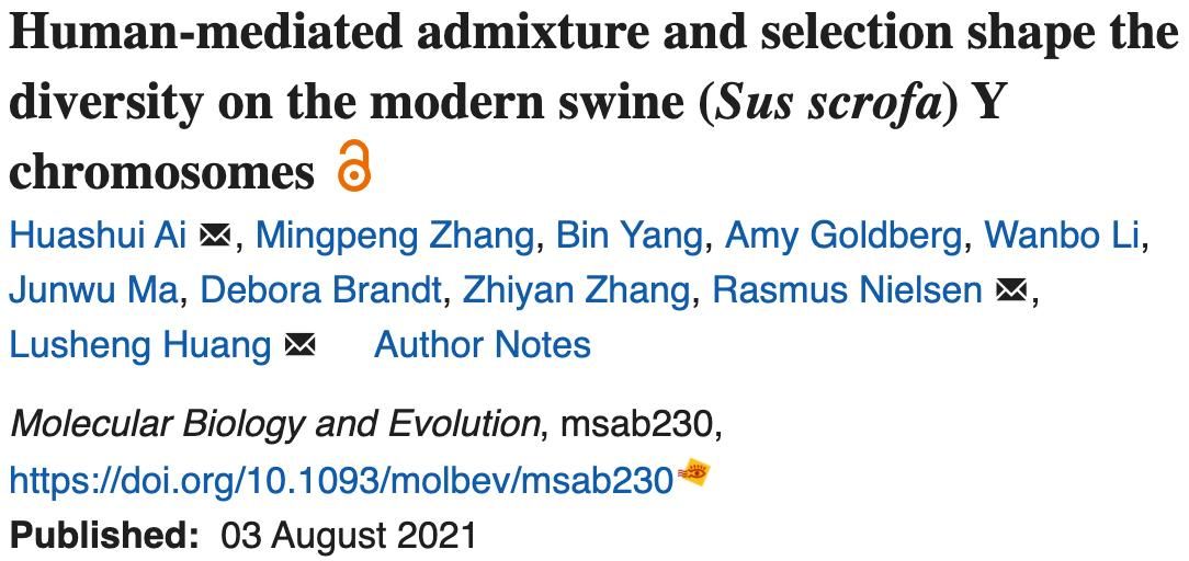 日前,我校豬遺傳改良與養殖技術國家重點實驗室黃路生院士團隊與加州大學伯克利分校等單位合作在《Molecular Biology and Evolution》(IF=16.24)發表題為“Human-mediated admixture and selection shape the diversity on the modern swine (Sus scrofa) Y chromosomes”的研究論文,系統闡述了人類介導的滲入和選擇塑造現代家豬Y染色體的多樣性以及從父系遺傳角度揭示豬的演化歷史。黃路生院士、學校首席教授艾華水研究員和加州大學伯克利分校Rasmus Nielsen教授作為共同通訊作者、2017級博士研究生張明鵬為共同第一作者,江西農業大學作為第一通訊作者單位。
