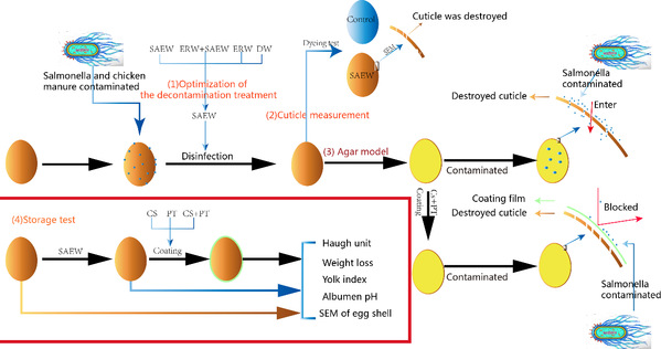 論文是團隊在之前研究中發現微酸性電解水對雞蛋具有較好貯藏保鮮效果,但卻對雞蛋殼膜產生損害后,系列性評估了微酸性電解水對雞蛋表面沙門氏菌的殺滅,對雞蛋殼膜的損害及損害殼膜雞蛋被微生物侵入的風險,隨后創新性的提出了利用果膠及殼聚糖涂膜解決微酸性電解水消毒后雞蛋殼膜被破壞的解決方法。