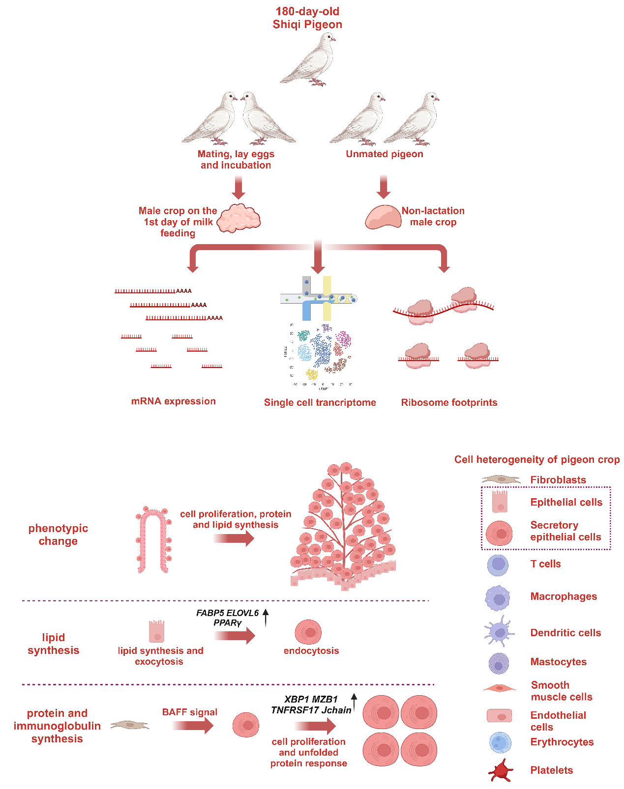 動物哺乳的生理過程及調控機制一直是人們的研究熱點。哺乳動物母體的哺乳行為不僅能維持幼崽生命,還能建立起母體與幼崽的親密關系。在一些鳥類,如鴿,嗉囊可以分泌富含蛋白質、脂肪的物質維持幼鳥生長、免疫所需。與哺乳動物不同的是,公鴿和母鴿同樣有泌乳和哺乳行為。哺乳動物的泌乳過程及調控機制的研究已較多,但鴿嗉囊分泌鴿乳的研究報道較少,且調控機制有待解析。本研究采用單細胞轉錄組、翻譯組、Bulk轉錄組三種測序手段,解析了公鴿嗉囊組織的細胞組成,鑒定了鴿乳中的脂質由基底層上皮細胞合成,而蛋白質及免疫球蛋白是由一種高表達漿細胞marker基因(Jchain、MZB1、XBP1等)的分泌型上皮細胞合成。本研究鑒定了公鴿嗉囊分泌鴿乳的分子機制,有助于鳥類及家禽生物學的理解。