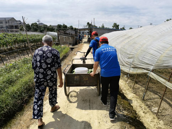 伴著蟬鳴,實踐隊走進田間地頭,了解群眾需求,為農民辦實事。隊員們戴著帽子、拿起鋤頭、背上水壺、握著剪刀進入大棚,施肥、鋤草、打理蔬菜,在廣袤的田野里,藍色的身影若隱若現,成為一道別致的風景線。在體驗灌溉、松土、采摘等勞作活動時,恰逢一位老人搬運新鮮采摘的農作物,隊員們立馬前去幫忙,推著三輪車運往到老人家中。老人與隊員們嘮家常,當談到他家的蔬菜時,老人如數家珍,一臉喜悅。雖炎炎烈日,個個汗流浹背,但隊員們望向田地里綠油油的蔬菜,都露出滿意的笑容,深感自豪。實踐隊深入推進“為群眾辦實事”活動,用心用情用力解決農民問題,展現青年風采!