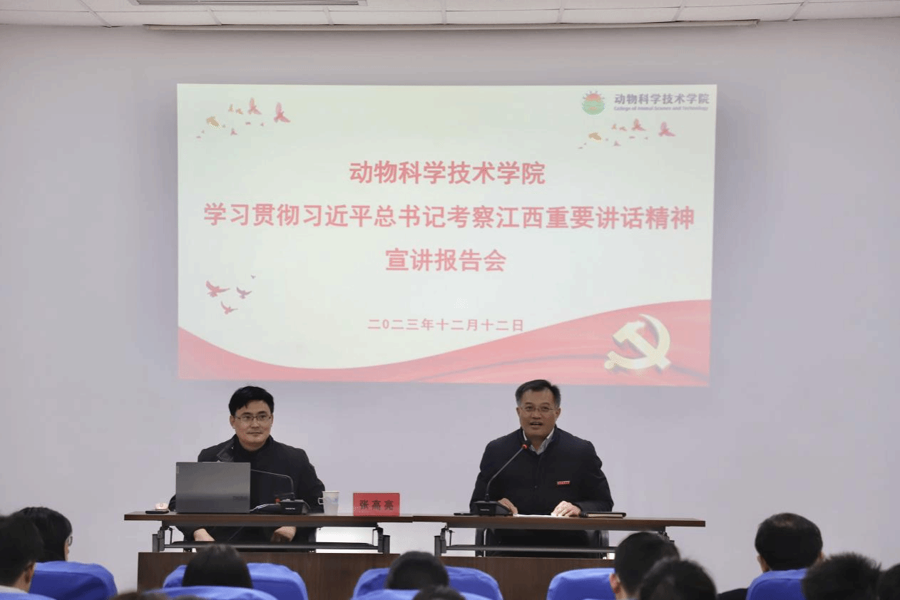 在全校上下要學習貫徹習近平總書記考察江西重要講話精神之際,12月12日下午,副校長、黨委委員張高亮赴動科院作宣講報告,學院師生黨員、團員青年等100余人聆聽報告。